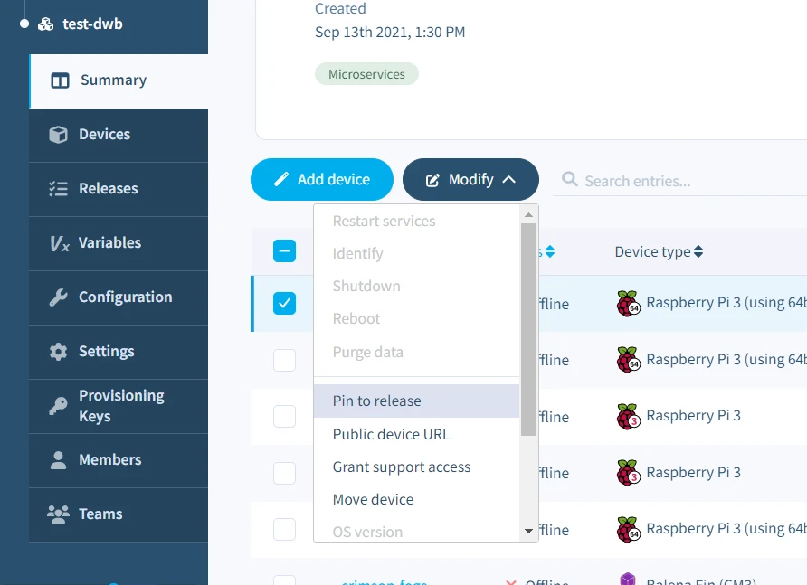 • On the Devices page, you can select one or more devices using the checkboxes present on the table. Next, open the Modify menu and select the Pin to release option.